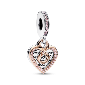 Duplica el amor que sientes hacia tu madre con el Charm Colgante Doble Corazones Infinitos Entrelazados. Un corazón con un recubrimiento electrolítico de oro rosa de segunda ley de 14k decorado con cristales artificiales de color rosa brillan junto a un corazón de plata de primera ley embellecido con la inscripción: «You are the heart of our family» (Eres el corazón de la familia) La anilla se presenta con gemas de color rosa y transparente engastadas en pavé. Este es el regalo perfecto para alguien que siempre ocupa un lugar especial en tu corazón.