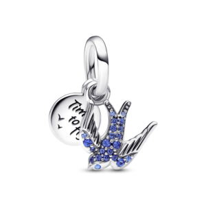 Extiende tus alas con nuestro charm colgante doble Golondrina reluciente y cita. Simbolizando la esperanza de un mejor mañana, esta pieza de plata esterlina representa una golondrina detallada con líneas ranuradas que semejan plumas y pavé en varios tonos de azul. La frase Tiempo para volar está grabada en un disco redondo detrás de la…