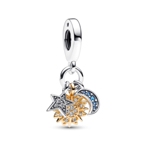 Dale un brillo de magia celestial a tu estilo de joyería con el charm colgante doble de dos tonos Celestial. Este charm combina tres íconos celestiales: un motivo de sol recubierto en oro de 14k con piedras brillantes y microesferas, una estrella de plata esterlina con pavé transparente y una luna creciente en plata esterlina…